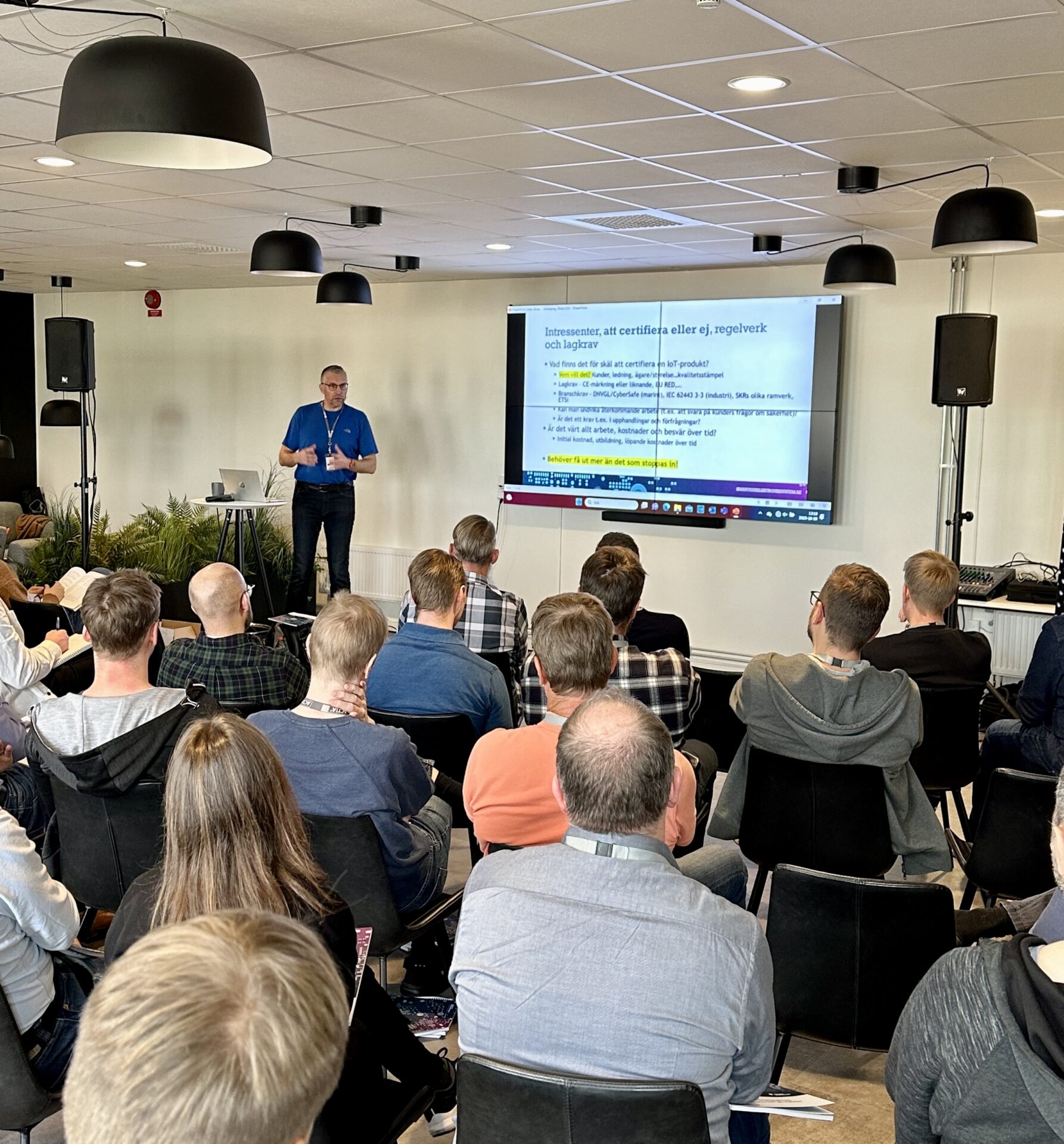 Under andra halvan av dagen hade vi John Lindström som presenterade cybersäkerhetshandboken. John tog upp vikten av att tänka cybersäkert från produktutvecklingens start, annars är det möjligt att det blir kostsamt. Han pratade också om viktiga regelverk som är på gång inom cybersäkra produkter.