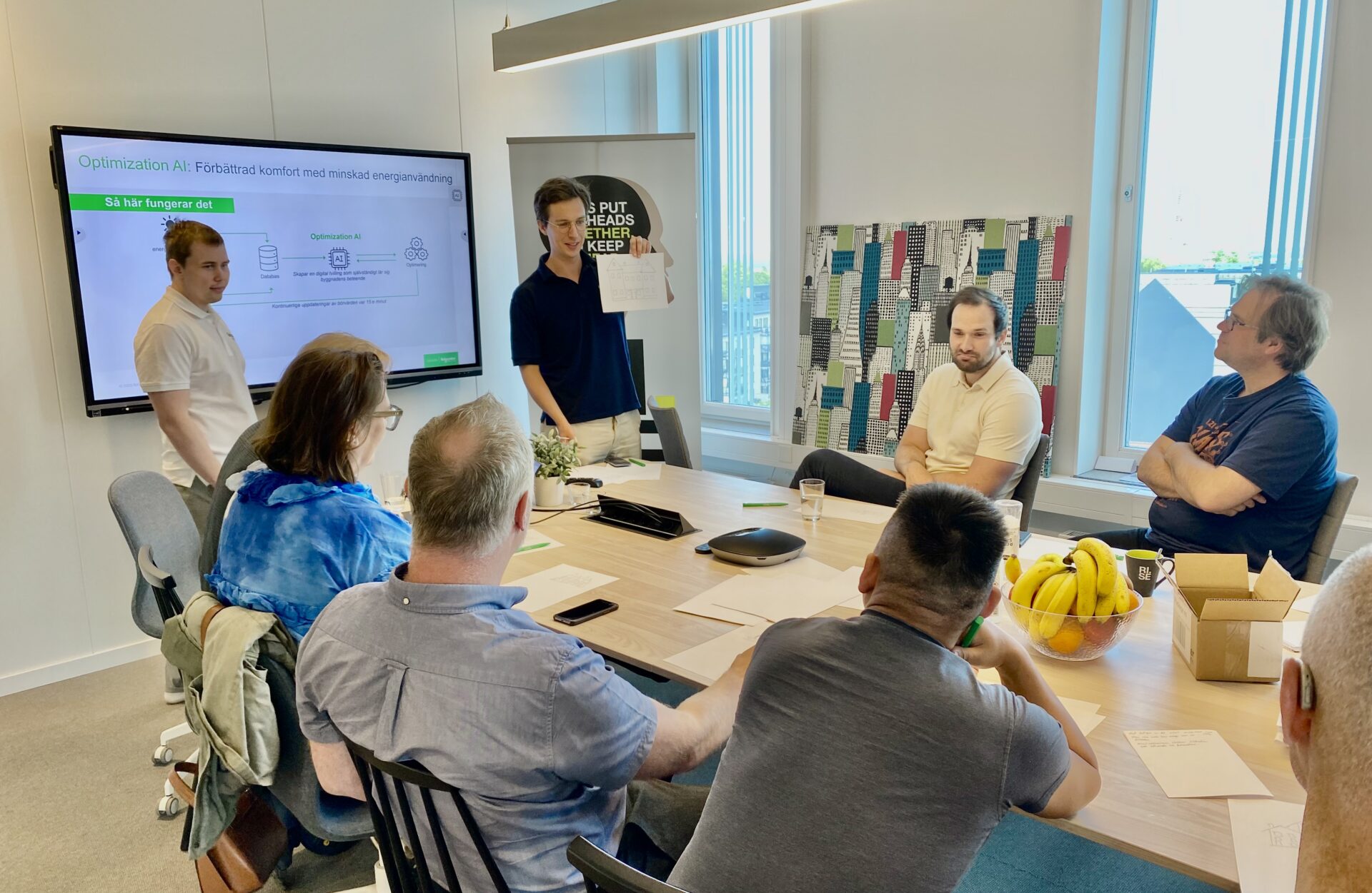 Under vårens sista Open Lab Day fick deltagarna en djupgående inblick i hur Schneider Electrics AI-optimeringssystem fungerar. Arvid Wahlman, Sales Representative och Joacim Claar, Design Solution Leader, båda från Schneider Electric, introducerade hur AI-teknologi kan energieffektivisera fastigheter och optimera driften. De visade hur AI kan tillämpas även i äldre byggnader och hur ett smart AI-system kan minska energiförbrukningen, reducera klagomål från hyresgäster och förlänga utrustningens livslängd genom prediktivt underhåll.