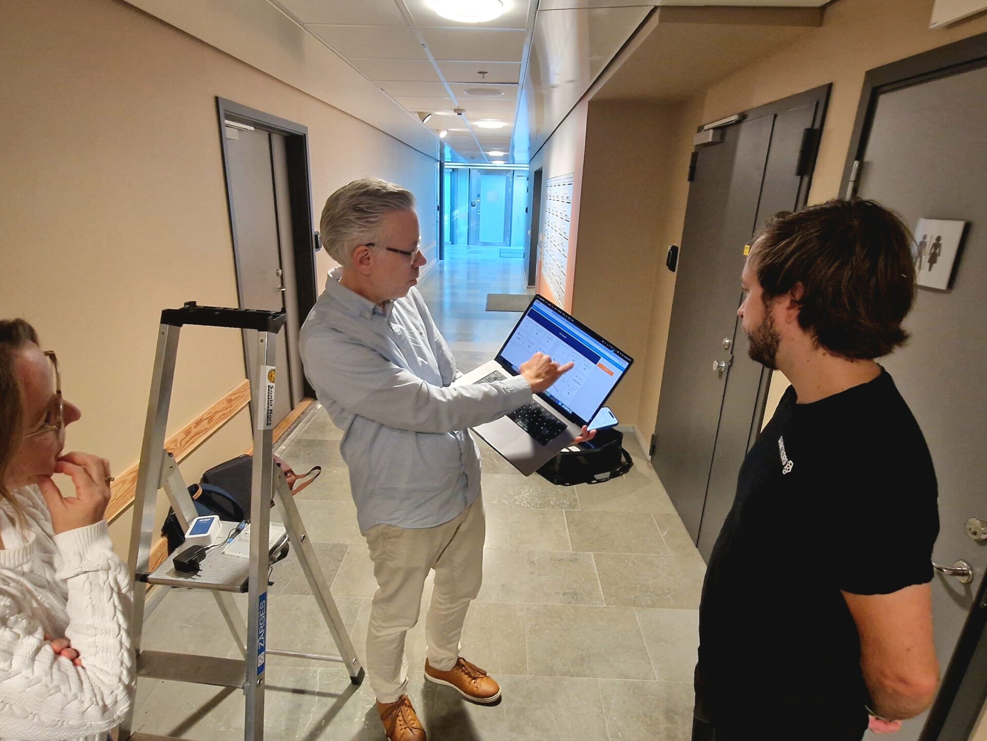 Ulf describing how the platform works and how you can follow the incoming data. Here outside the restrooms in Mjärdevi Center.