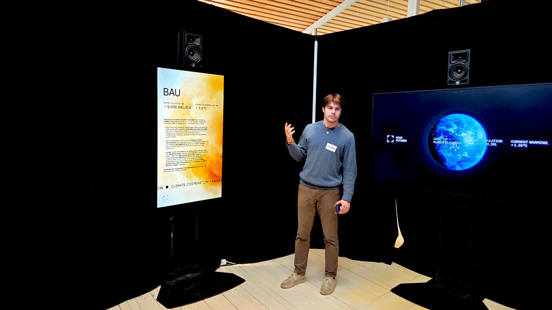 Inne i ett mörkt rum med skärmar och högtalare fick vi se hälsningar från människor i respektive framtid. I scenariot collapse gömde sig en kvinna tillsammans med sin dotter från plundrare. Allt hade tagit slut och människor slogs för förnödenheter mitt i extremväder och pandemier. Som en stark motpol visade scenariot transform en man som befann sig i Sydafrika. Han hade behövt ge upp mycket av det som är vår vardag , inte minst sin konsumtion, men deras samhälle blomstrade och miljön var på väg att läka.